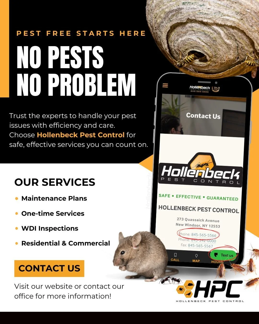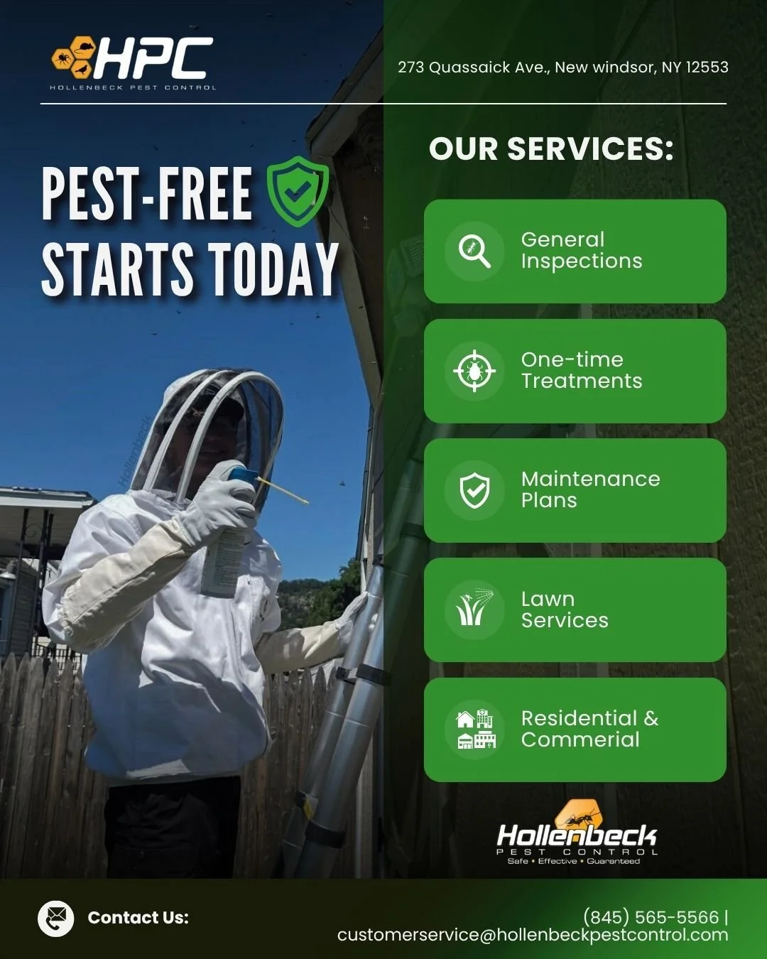Hollenbeck Pest Control, in New York's Hudson Valley, are experts in the pest control industry and is the Reader's Choice winner 5 years in a row. Providing the greatest value, we perform a thorough inspection so we can provide the right service for your home. Our focus for our pest and wildlife services is the safest and most successful outcome in ridding your home of pests. Our exterminators are here to help!