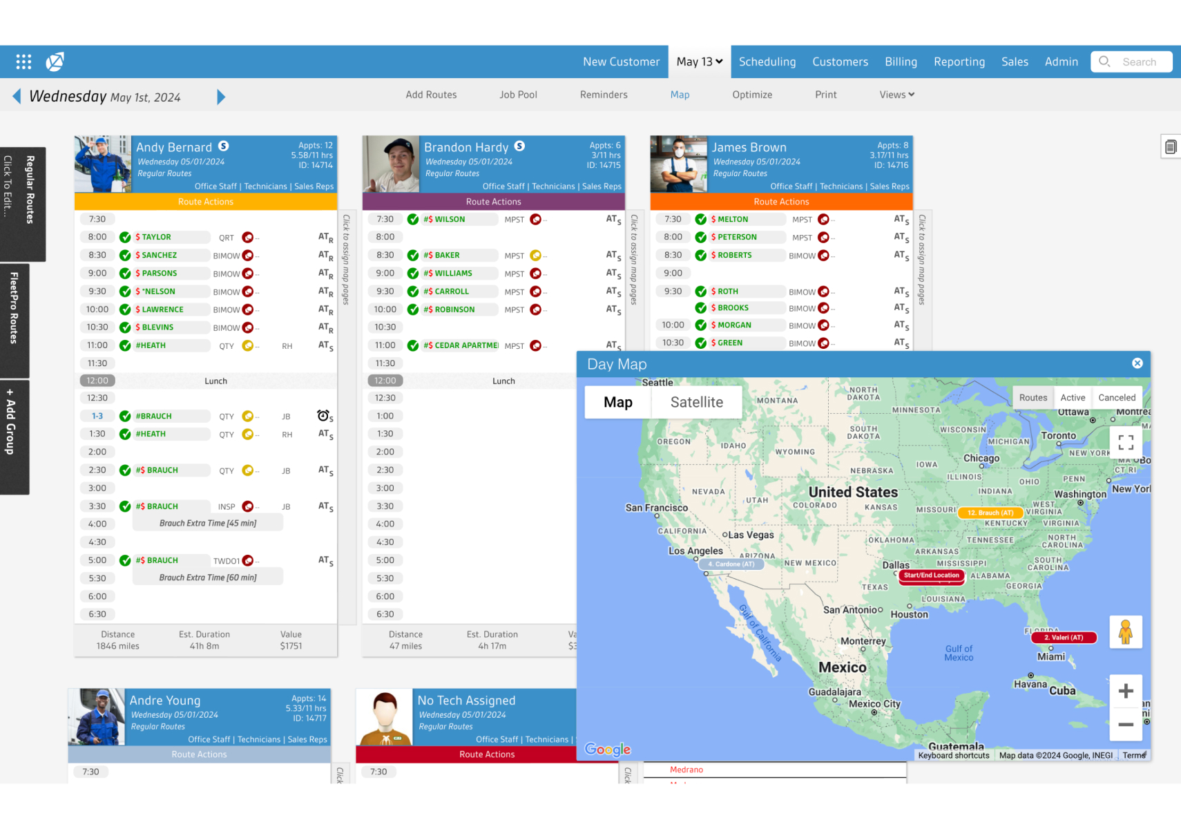 Intelligent Routing and Scheduling: FieldRoutes allows Hollenbeck Pest Control to set up regions, use visual grouping, and apply intelligent routing. This keeps their technicians nearby, boosts production, and reduces travel costs, resulting in faster service for customers.