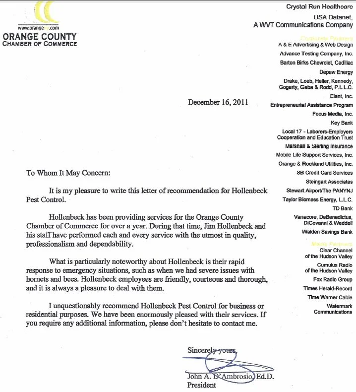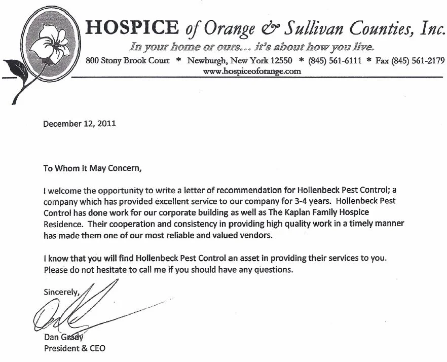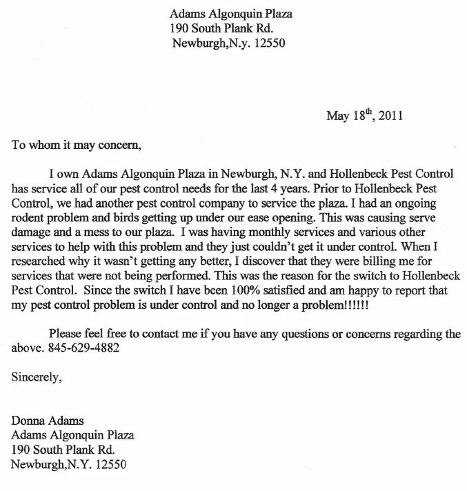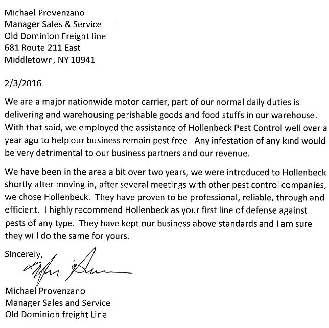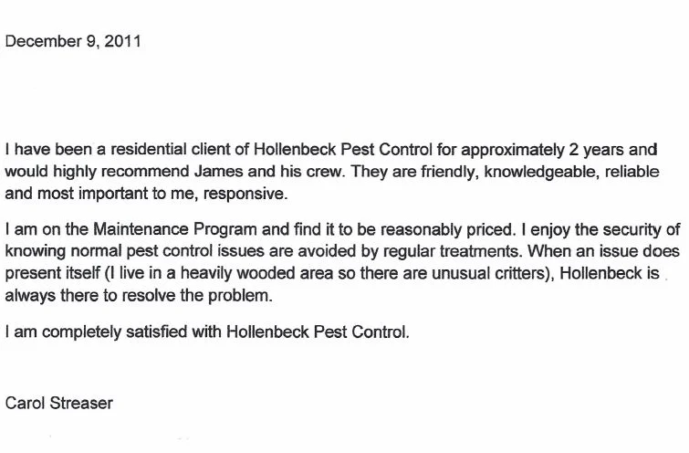 “This is a great pest control company to work with in eliminating a pest problem. Their technicians are experienced and well-trained in the newest procedures to eliminate whatever your specific problem might be. Their treatments absolutely work. I know!! I recommend Hollenbeck Pest Control as the “go to” company for any pest problem you might have. They cover them all!”